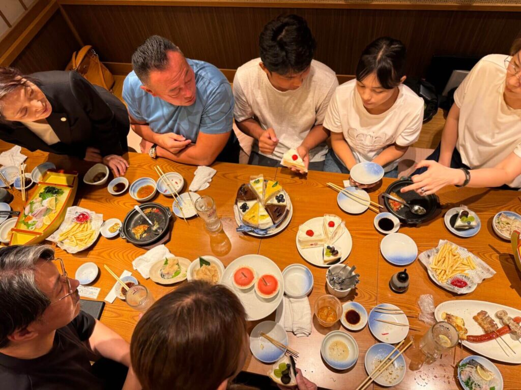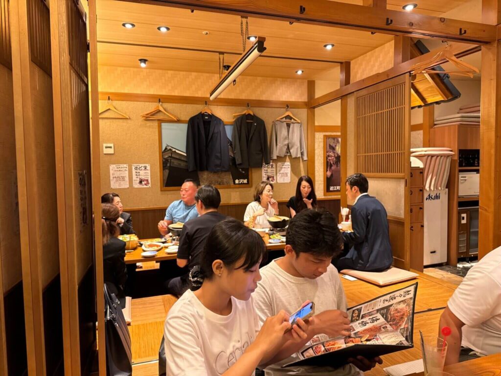 会場は弊社で運営する”さかなや道場金沢駅店”です。当日は各事業部とグループ会社の社員が10名と役員が出席して、日ごろ交流のが少ない人同士が、お互いのお店や職場について、楽しく会話していました。